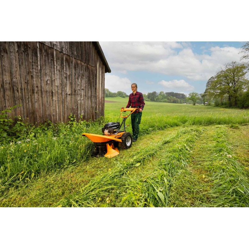 Grâce à sa transmission à quatre vitesses intégrant un différentiel à glissement limité automatique, la rotofaucheuse excelle même sur des terrains inclinés jusqu'à 20°. Le différentiel à glissement limité automatique garantit qu’une seule roue ne patine pas, bloque l’essieu et permet une propulsion optimale. En virage, le différentiel reste ouvert, facilitant ainsi les manœuvres. Par ailleurs, la large gamme de vitesses (1,9 à 4,6 km/h) permet un ajustement parfait à la nature du terrain.